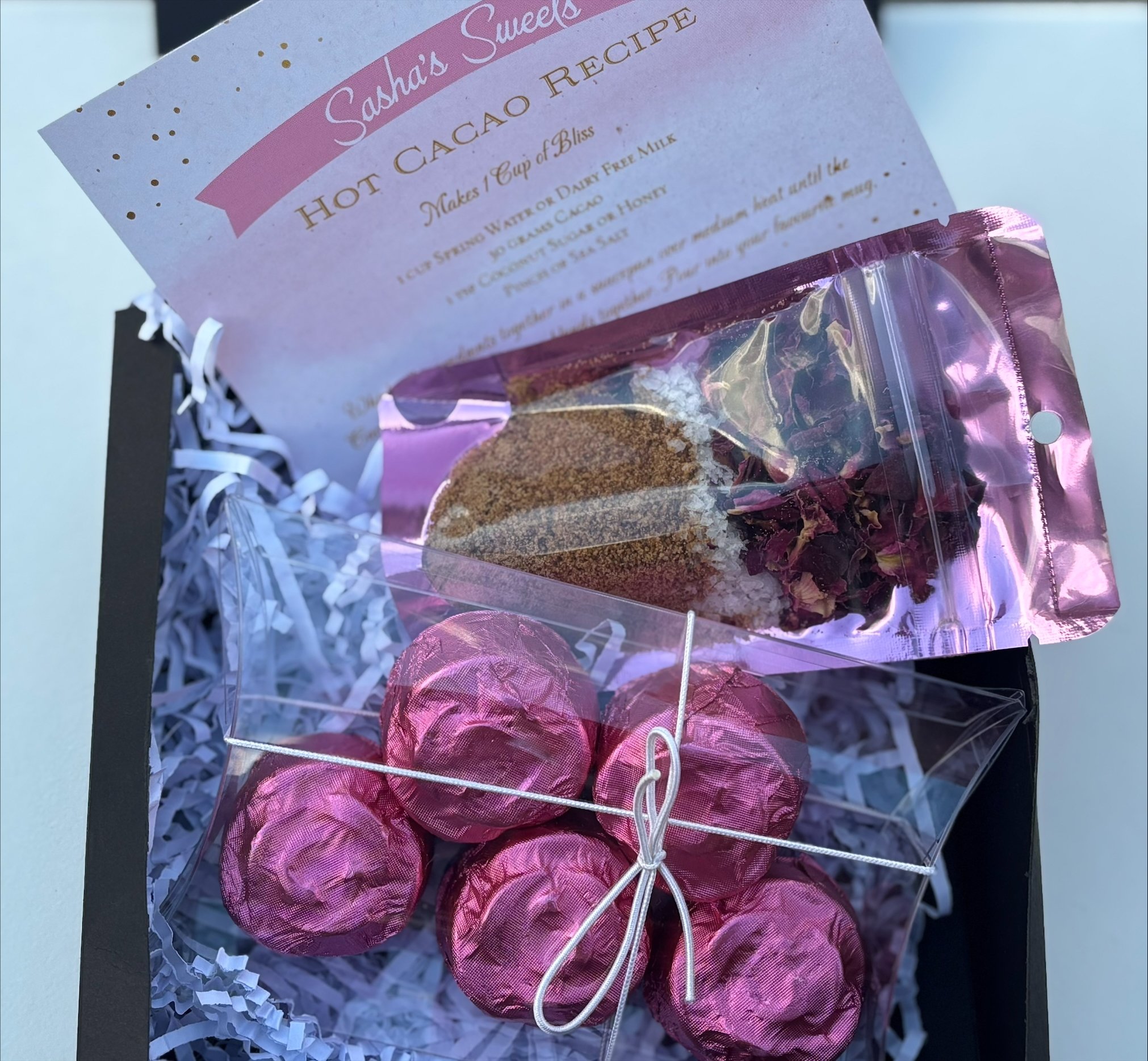 Warm your Soul through the Frosty Seasons while Sipping your Cells into a State of Bliss. Sasha’s Sweets Box of Hot Cacao was created to Nourish Canadians like our Grandmothers used to & Designed to Ship across Canada like it’s 2025. This Recipe is a mix between a Hot Chocolate Bomb & a Cup of Ceremonial Cacao. All you need to add is one Magic Ingredient ~ Water! Each Box makes 5 Cups of Bliss. Always enjoy with Gratitude.